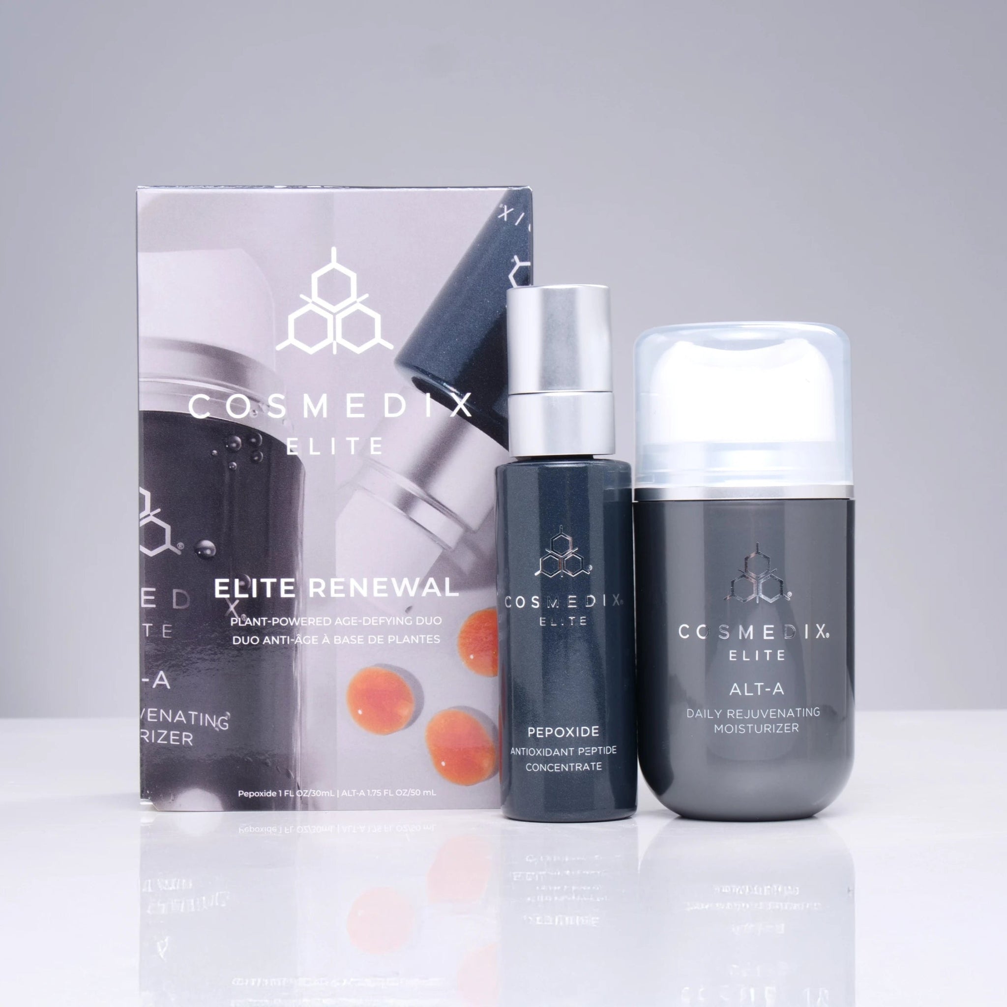Redefine your age-defying routine with this gentle yet effective skincare duo. Elite Renewal combines the antioxidant and peptide power of Pepoxide with the retinol-alternative benefits of Alt-A to help visibly smooth fine lines, firm skin, and improve texture—without the harsh side effects. Ideal for anyone seeking a high-performance routine with a gentle touch, this rejuvenating pair supports skin resilience, hydration, and daily protection against environmental stressors.