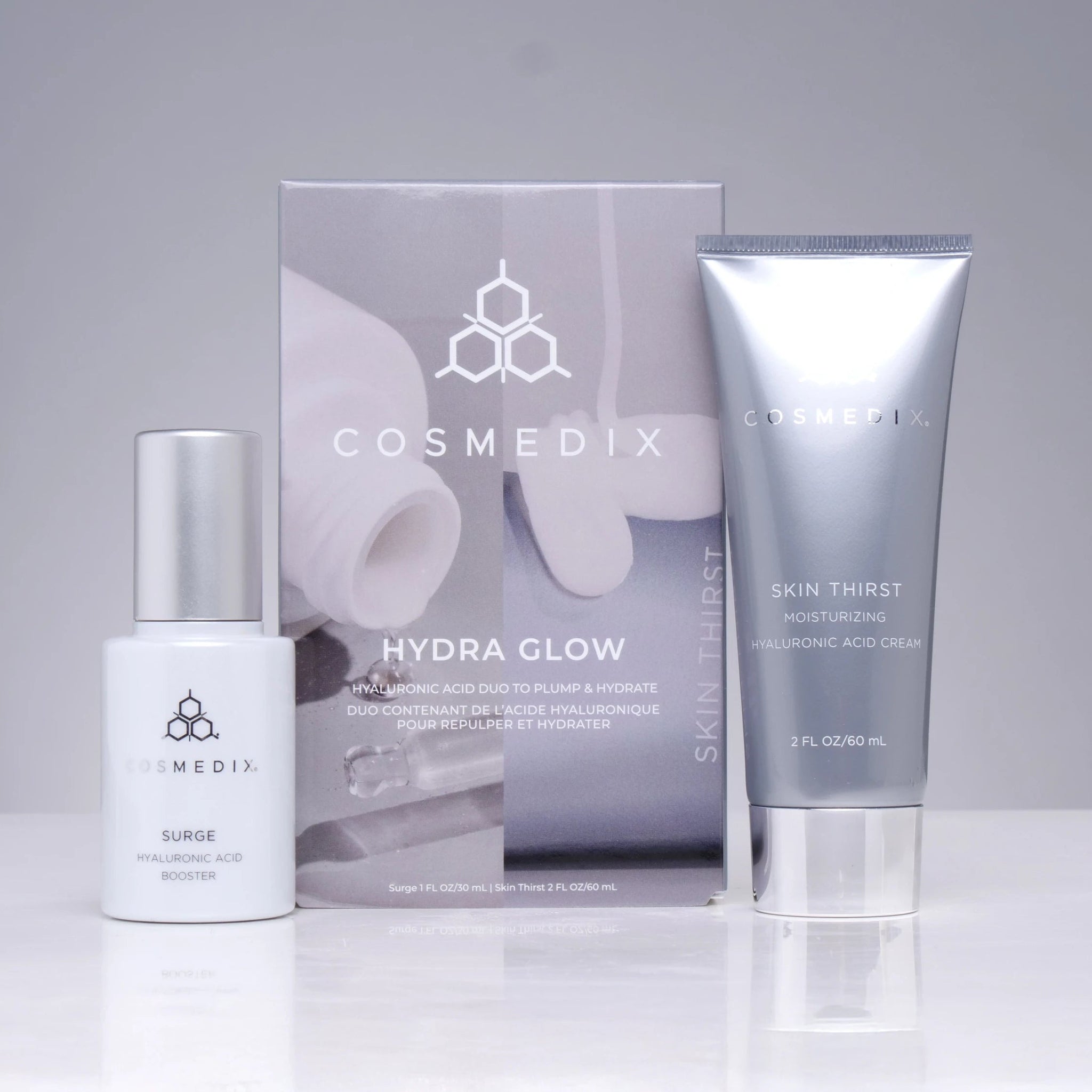 Drench skin in intense hydration with this moisture-rich duo featuring Surge and Skin Thirst. These hydration heroes work together to plump, replenish, and lock in moisture - helping to smooth rough texture and restore skin's natural bounce for a supply, dewy finish.